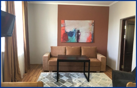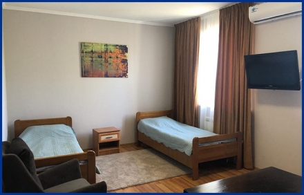 Номер состоит из двух комнат, полностью оборудованной кухни и просторной прихожей. В каждом номере теплые полы, совмещенный санузел, холодная и горячая вода (термальная, из собственных артезианских скважин), спутниковое телевидение, кондиционер, двуспальная и односпальные кровати, диван, шкаф для одежды, прикроватные тумбы, стол и стулья, кресло, постельное белье и полотенца, туалетная бумага.